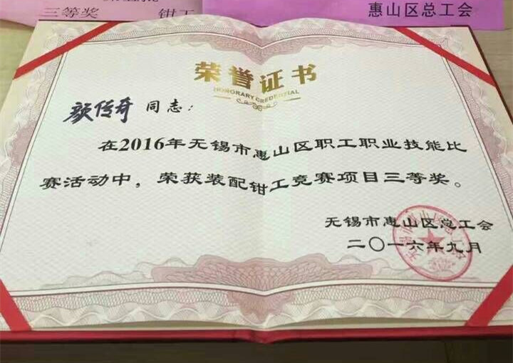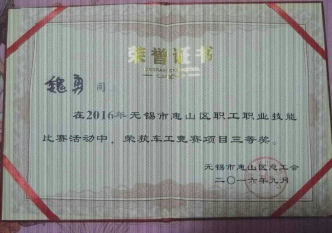 我司總裝車間顏傳奇、金工車間魏勇在初賽中脫穎而出,作為陽山鎮代表參加此次惠山區職工職業技能大賽,并雙雙獲得三等獎。