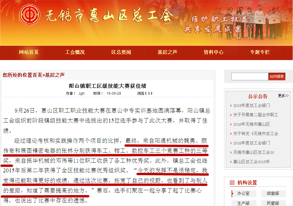 9月26日, 2016年惠山區職工職業技能大賽在惠山中等專業學校實訓基地鳴鑼開賽; 這次比賽結束獲獎的顏傳奇、魏勇在“無錫市惠山區總工會”網站上刊登表揚。如圖所示